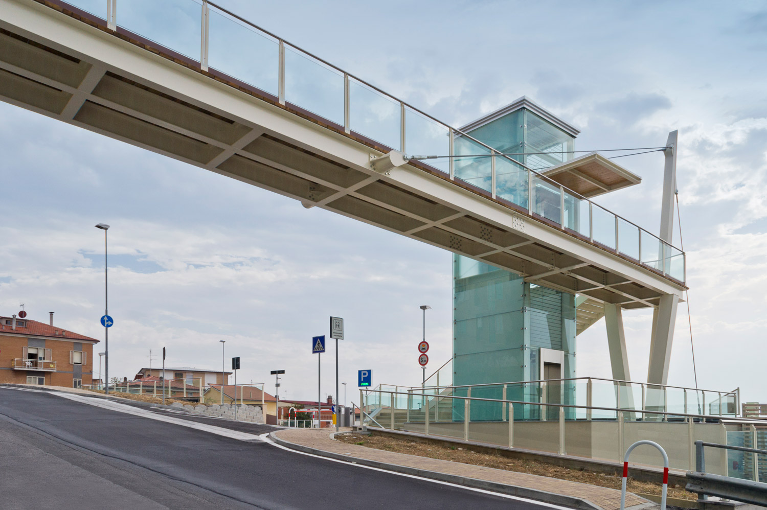 Sorge a Fermo sul versante ovest della città, come opera di urbanizzazione primaria, in un’area interessata dalla contigua presenza di attrezzature sportive (Piscina Comunale), Comando provinciale dei Carabinieri e complesso ospedaliero. Un importante intervento geotecnico si è reso necessario per la stabilizzazione del versante ai piedi del quale sorge l’edificio, a beneficio dell’intera area. Il complesso è composto da due piani seminterrati realizzati allo scopo di limitare al massimo l’impatto della struttura nel tessuto urbano circostante. Da ciò deriva anche la scelta dei frangisole in cotto fatto a mano per il rivestimento esterno, realizzati su progetto e posati a secco su struttura metallica in acciaio inox, e dei materiali della passerella pedonale sopraelevata (prevista dal PRG per collegare il parcheggio al vicino ospedale) realizzata in struttura leggera di acciaio, vetro e legno lamellare.